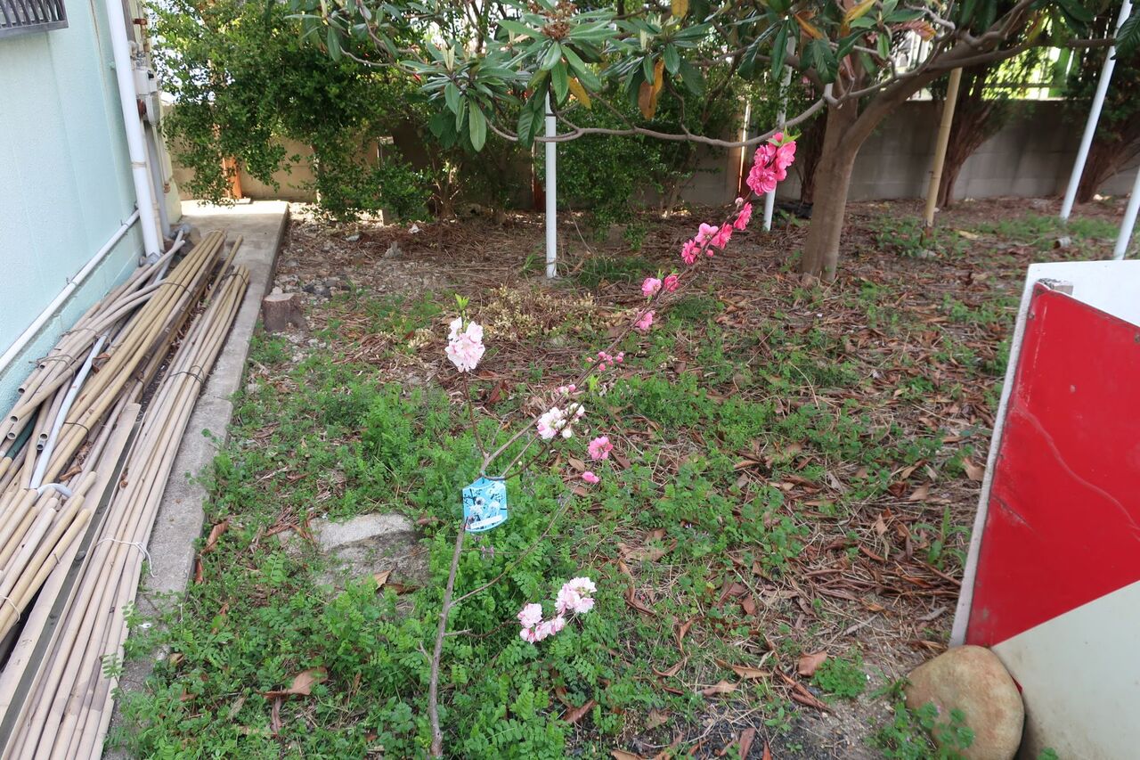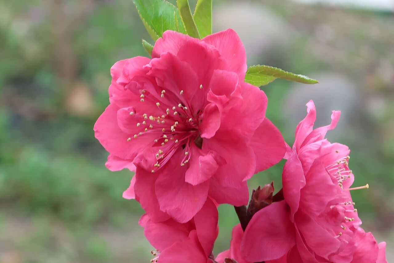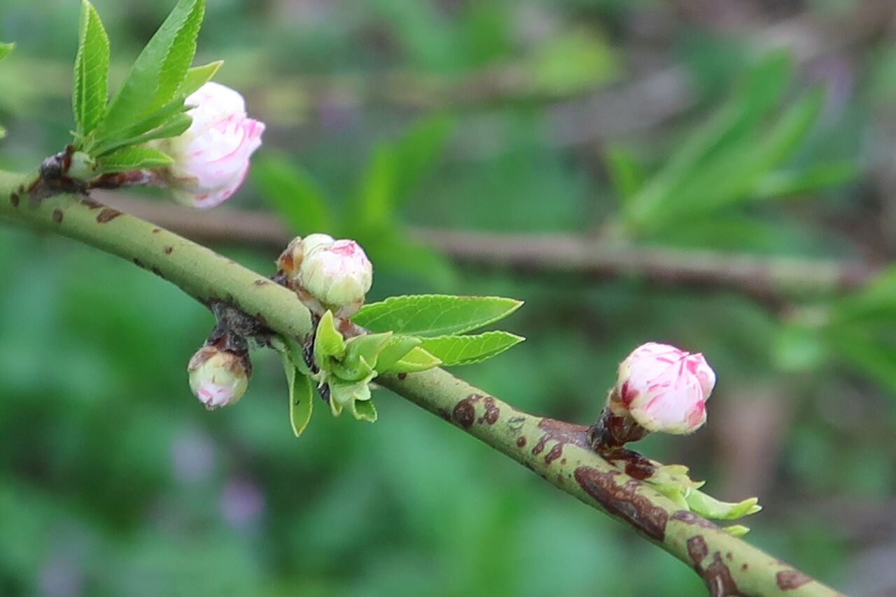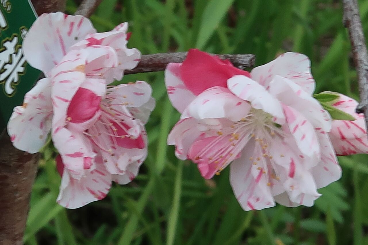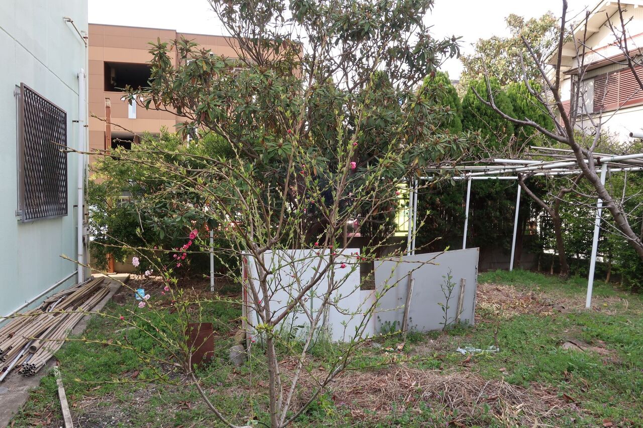 会社の裏庭には 2羽 3本の花桃が植わってます。