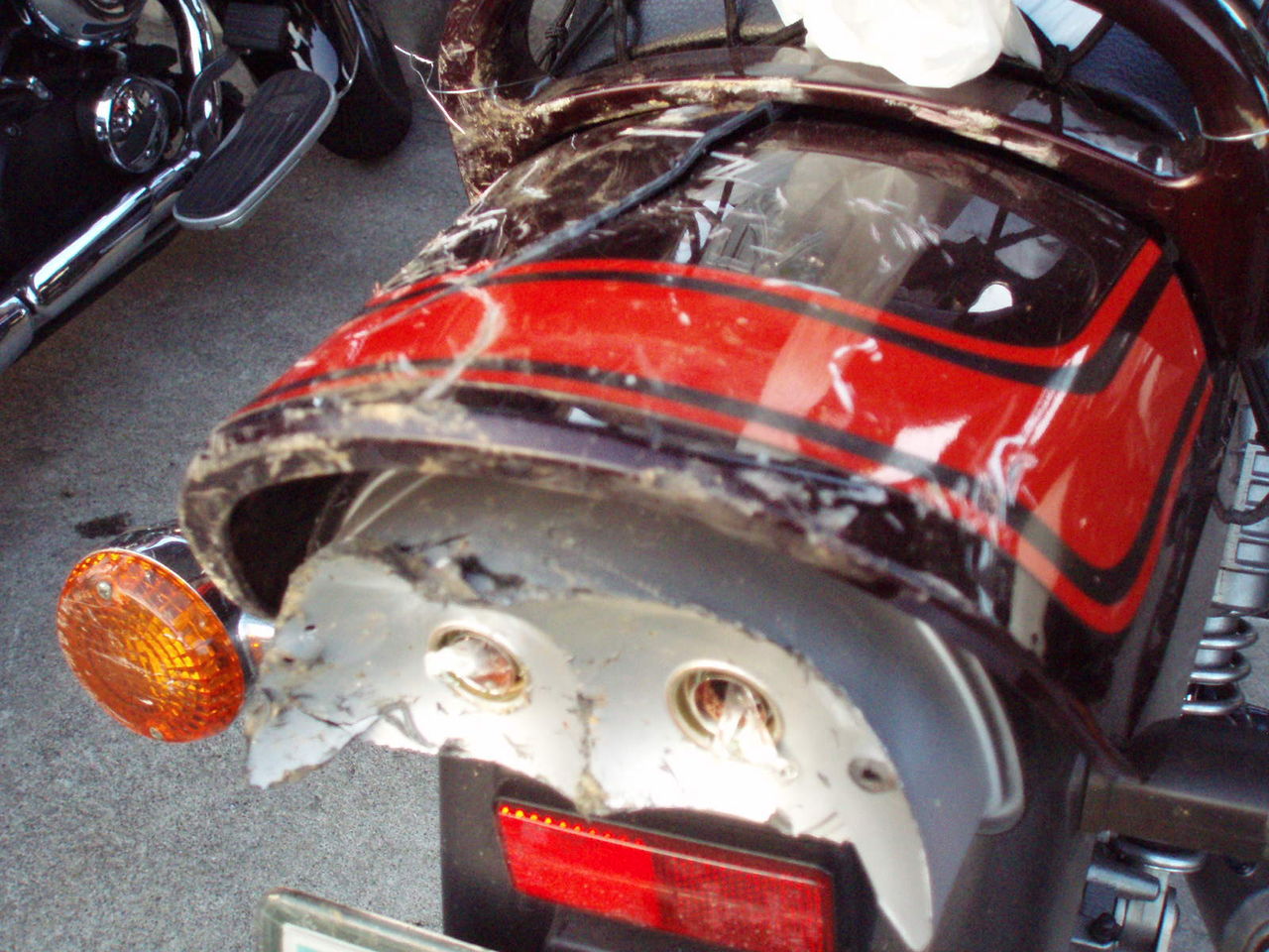 前輪のホイールが曲がって、ヘッドライトとウインカーが壊れて、クランクケースが割れて、